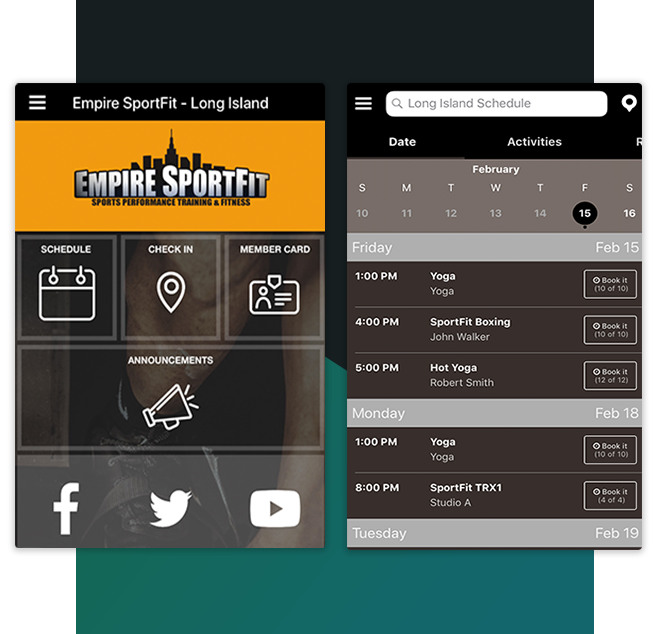 A branded mobile app promotes your facility’s brand and enhances communication. Clients can access facility details, connect via social media, check schedules, and view trainer profiles—all within your branded app. Plus, you can engage members with targeted push notifications and eliminate physical membership cards by integrating with mobile wallets. Available in both the Apple and Android app stores.
