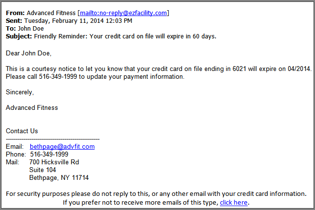 Have you ever tried to process a customer’s monthly membership or package renewal only to be declined due to an expired credit card? An expired card can lead to lost revenue and wasted staff hours as necessary follow-ups must ensue to acquire updated billing information. EZFacility’s Development Team has released a brand new feature that focuses on eliminating this all-too-frequent scenario – Automatic Credit Card Notification Emails.