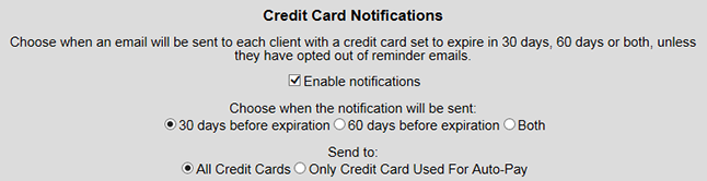 In the Billing Preferences page, you can now choose if and when customers are notified that their credit card on file is about to expire. First, enable these notifications, so that the system knows to start sending these reminders on your behalf. Then choose whether the system should send notifications 60 days before expiration, 30 days before expiration, or on both days. Lastly, select whether these notifications are to go to everyone with cards on file, or just those who use their credit cards for Autopay.