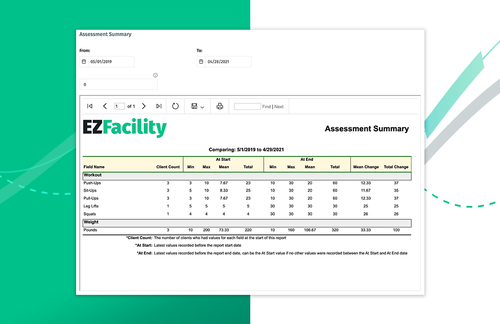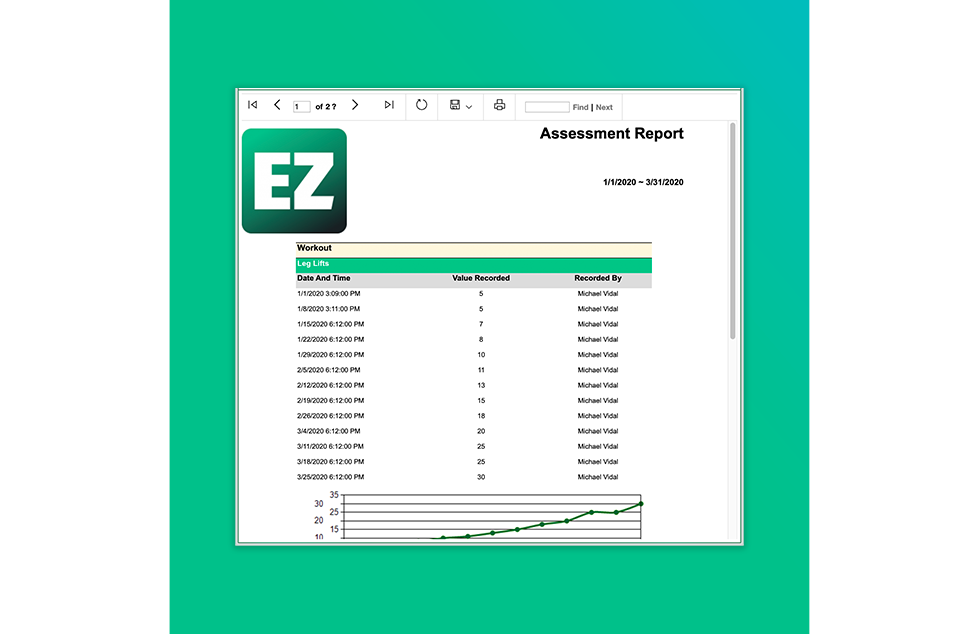 Quickly view success history for a specific time frame. View and share reports with members based on individual accomplishments and pull reports summarizing facility-wide totals. Export data to .xml, .csv, pdf, MHTML, Excel, Word, or tiff file formats.